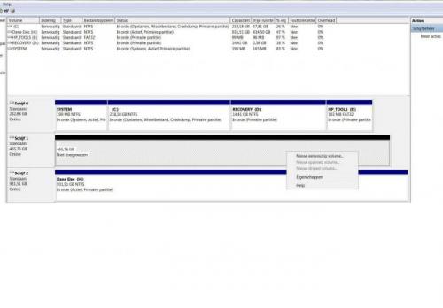 8. Met dank voor dit bericht, als ik rechtsklik op de niet toegewezen schijf zoals getoont wordt in de handleiding krijg een ander scrolldown menu, de optie "stationsletter en paden wijzigen" wordt niet getoond. ---------- Post toegevoegd om 16:01 ---------- Vorige post was om 15:59 ---------- Ik krijg enkel de mogelijkheid om "Nieuw eenvoudig volume" "Eigenschappen" en "Help" te kiezen. Verder staat in het scrolldown menu (maar in grijs die niet mogelijk om te selecteren) "Nieuw spannend volume" en "Nieuw stripped volume"