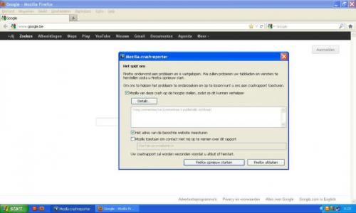 hier nog een paar gegevens :oepassingsbasics Naam Firefox Versie 12.0 Useragent Mozilla/5.0 (Windows NT 5.1; rv:12.0) Gecko/20100101 Firefox/12.0 Profielmap Ingeschakelde plug-ins about:plugins Buildconfiguratie about:buildconfig Crashrapporten about:crashes Geheugengebruik about:memory Extensies Naam Versie Ingeschakeld ID eID België1.0.14truebelgiumeid@eid.belgium.beAVG Safe Search12.0.0.1912false{1E73965B-8B48-48be-9C8D-68B920ABC1C4}DataMngr1.0false{1FD91A9C-410C-4090-BBCC-55D3450EF433}Java Quick Starter1.0falsejqs@sun.comMicrosoft .NET Framework Assistant0.0.0false{20a82645-c095-46ed-80e3-08825760534b}Searchqu Toolbar4.6.1.01false{99079a25-328f-4bd4-be04-00955acaa0a7} Belangrijke aangepaste voorkeuren Naam Waarde accessibility.typeaheadfind.flashBar0browser.cache.disk.capacity1048576browser.cache.disk.smart_size.first_runfalsebrowser.cache.disk.smart_size_cached_value778240browser.display.background_color#C0C0C0browser.display.use_system_colorstruebrowser.places.smartBookmarksVersion2browser.startup.homepagehttp://www.google.be/browser.startup.homepage_override.buildID20120420145725browser.startup.homepage_override.mstonerv:12.0extensions.lastAppVersion12.0keyword.URLhttp://dts.search-results.com/sr?src=ffb&appid=164&systemid=406&sr=0&q=network.cookie.prefsMigratedtrueplaces.database.lastMaintenance1335702637places.history.expiration.transient_current_max_pages11731places.history.expiration.transient_optimal_database_size18768854print.print_printerHP Deskjet 3740 Seriesprint.printer_HP_Deskjet_3740_Series.print_bgcolorfalseprint.printer_HP_Deskjet_3740_Series.print_bgimagesfalseprint.printer_HP_Deskjet_3740_Series.print_commandprint.printer_HP_Deskjet_3740_Series.print_downloadfontsfalseprint.printer_HP_Deskjet_3740_Series.print_edge_bottom0print.printer_HP_Deskjet_3740_Series.print_edge_left0print.printer_HP_Deskjet_3740_Series.print_edge_right0print.printer_HP_Deskjet_3740_Series.print_edge_top0print.printer_HP_Deskjet_3740_Series.print_evenpagestrueprint.printer_HP_Deskjet_3740_Series.print_footercenterprint.printer_HP_Deskjet_3740_Series.print_footerleft&PTprint.printer_HP_Deskjet_3740_Series.print_footerright&Dprint.printer_HP_Deskjet_3740_Series.print_headercenterprint.printer_HP_Deskjet_3740_Series.print_headerleft&Tprint.printer_HP_Deskjet_3740_Series.print_headerright&Uprint.printer_HP_Deskjet_3740_Series.print_in_colortrueprint.printer_HP_Deskjet_3740_Series.print_margin_bottom0.5print.printer_HP_Deskjet_3740_Series.print_margin_left0.5print.printer_HP_Deskjet_3740_Series.print_margin_right0.5print.printer_HP_Deskjet_3740_Series.print_margin_top0.5print.printer_HP_Deskjet_3740_Series.print_oddpagestrueprint.printer_HP_Deskjet_3740_Series.print_orientation0print.printer_HP_Deskjet_3740_Series.print_page_delay50print.printer_HP_Deskjet_3740_Series.print_paper_data9print.printer_HP_Deskjet_3740_Series.print_paper_height 11,00print.printer_HP_Deskjet_3740_Series.print_paper_size_type0print.printer_HP_Deskjet_3740_Series.print_paper_size_unit1print.printer_HP_Deskjet_3740_Series.print_paper_width 8,50print.printer_HP_Deskjet_3740_Series.print_reversedfalseprint.printer_HP_Deskjet_3740_Series.print_scaling 1,00print.printer_HP_Deskjet_3740_Series.print_shrink_to_fittrueprint.printer_HP_Deskjet_3740_Series.print_to_filefalseprint.printer_HP_Deskjet_3740_Series.print_unwriteable_margin_bottom0print.printer_HP_Deskjet_3740_Series.print_unwriteable_margin_left0print.printer_HP_Deskjet_3740_Series.print_unwriteable_margin_right0print.printer_HP_Deskjet_3740_Series.print_unwriteable_margin_top0privacy.popups.showBrowserMessagefalseprivacy.sanitize.migrateFx3Prefstruesecurity.warn_viewing_mixedfalse