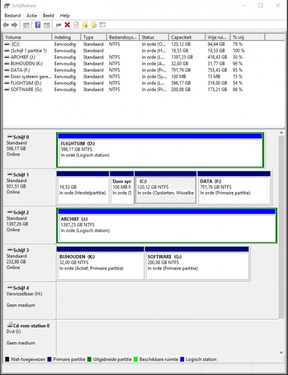Hey! Passer en Droske, Zoals ik verteld had heeft mijn systeem zich vanzelf hersteld. ( zie 'PC problemen automatisch oplossen' ) Hu heb ik eergisteren en gisteren een verwittiging gekregen door mijn zelfde systeem, dat het eigenlijk niet hersteld is, want ik kreeg die twee dagen 's morgens bij het aanzetten van mijn pc telkens een bericht.. "we hebben geen operating systeem gevonden. Ontkoppel alle buitenboord schijven en herstart de pc"... of zoiets, het was in het Engels. Ik heb echter telkens gewoon met Ctrl-Alt-Del terug kunnen herstarten, en telkens is dat gelukt, zodat ik gewoon kon werken. Deze namiddag moest ik weer herstarten na een win10 update, en had ik hetzelfde. Maar in plaats van op dezelfde manier te kunnen herstarten, is het systeem vanzelf in de cyclus van de lichtblauwe helpschermen gegaan ( zie ook in voorgaande topic... ) en vermeldde even dat er wat mis was met de harde schijf. Mijn systeem heeft dan zelf de fout aan de harde schijf hersteld en is even later weer vanzelf opgestart. Voorlopig loopt alles weer goed, maar... Een en ander wijst er toch op dat er wat mis is met mijn C:-schijf. Zie hieronder een printscreen van mijn schijvenopstelling. Zoals je kan zien is mijn schijf 1 opgedeeld in 4 delen, waarvan een deel mijn drive C is. Dat is historisch zo gegroeid, die partities zijn aangemaakt reeds 3-4 jaar geleden, of mogelijk zelfs langer, en dat heeft altijd goed gewerkt zowel onder Windows XP als ook onder Windows 7. Tot nu toe werkte dat onder Windows 10 ook goed, mar sinds enkele weken tot een maand zijn er dus problemen. Schijf O is mijn belangrijkste schijf, daarop staat mijn Flight Simulator en niets anders, Schijf 2 is buitenboord en mijn archief van bestanden, en schijf 3 is eveneens buiten boord en bevat ook 2 partities met allerlei software en andere belangrijke data. Voorlopig kan ik dus daarmee werken, zoals dat altijd geweest is, maar ik vrees toch dat er nu iets moet gedaan worden om die opstartproblemen gedaan te maken. Ik kom dus nog even vragen of jullie me toch nog wat raad kunnen geven? Met dank op voorhand. Groeten Jive1 - Belgium -