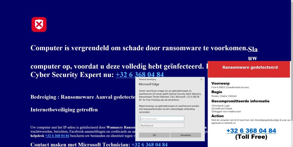 Goeie morgen! Voorlopig lijkt het me een ernstig zeer zware aanval.... Reeds enkele malen had ik in het verleden hetzelfde bericht gekregen, maar ik heb het genegeerd. Ik heb gisteren na dat bericht met Spybot een volledige scan gedaan van mijn pc, en die vond een vrij groot aantal fouten, die zijn allemaal gecleand ondertussen. Een amateuristisch klinkende vrouwelijks stem zei me plots dat mijn computer geblokkeerd is omdat die werd aangevallen door ransomware. terzelfdertijd zag ik een variante van dat bericht op mijn scherm, dat me aanspoorde mijn computer niet af te zetten, niets te doen met mijn muis en met mijn klavier, kortom totaal niets te doen behalve mijn gebruikersnaam en paswoord op te geven in een daartoe mee op scherm getoond formuliertje, en dat op vraag van de server oxox16.xyz Het spreekt vanzelf dat ik zoiets nooit zou doen. Ook zou mijn IP geblokkeerd zijn door MS om hun netwerk te beveiligen. De server oxox16.xyz geeft namelijk internet alert. WanaCry Ransomwere Thread detected. Call Microsoft +32 6 386 04 84 for free Checkup aan de serverbron. Waarschuwing: uw gebruikersnaam en wachtwoord worden mlet basisauthenticatie via een onbeveiligde verbinding verzonden. Allemaal op zijn minst gezegd: VERDACHT! Raar echter dat mijn PC gewoon blijft verderwerken, behalve dat ik op Edge af en toe nog die zelfde waarschuwingen krijg, niet echter op Internet Explorer. Het bericht schijnt gekomen te zijn van ene server oxox16.xyz/belg_bg/dutch/indexxxx.php, maar als ik daarover iets ga opzoeken, dan vind ik van dat adres niets...; Opvallend ook is dat de stick waarmee ik de beelden van mijn niewe pc, waarop de vreemde waarsschuwing gekomen is, gekopiërd heb om ze naar deze, mijn oude pc te brengen, nu beveiligd is, en ik kan die nniet zo maar direct vrijmaken om die terug te gebruiken.... maar dat zal ik mogelijk achteraf wel kunnen oplossen, denk ik.. Zie enkele bijlagen hieronder. Kan u me helpen, aub? Groeten Jive1 - Belgium