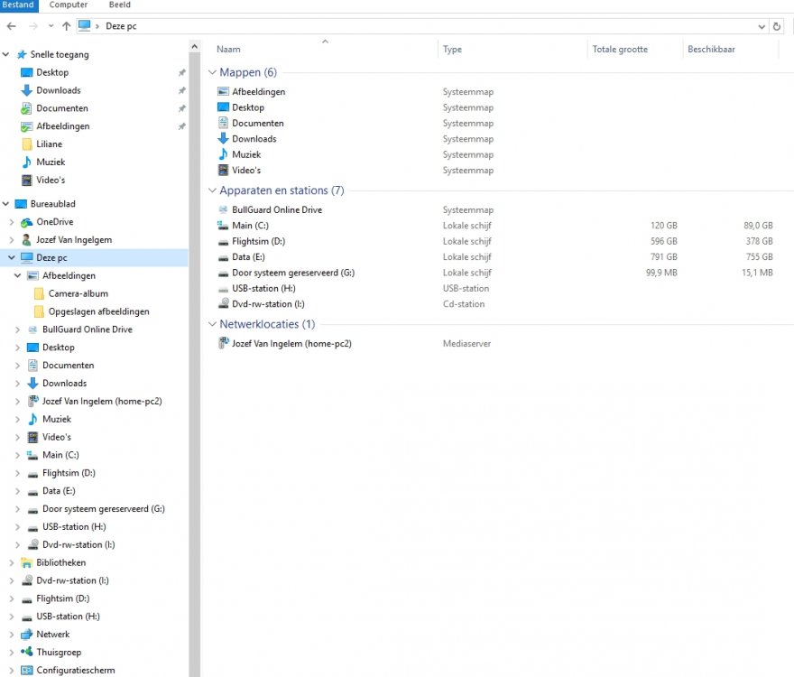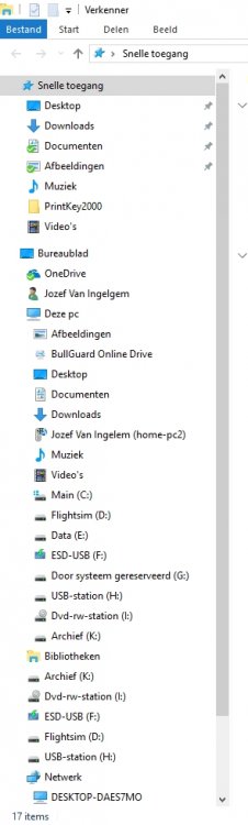 Hey! Passer, Ik heb even de twee externe drives uitgeschakeld, afgekoppeld. Dan ziet mijn Verkenner er uit als in beeld in bijlage Merk opdat in de linkse kolom de drives nog steeds meerdere malen te zien zijn, en in de rechtse kolom, na in de linke kolom geklikt te hebben op 'Deze PC' alles slechts éénmaal te zien is. Wat me erop wijst dat er eigenlijk niets verandert als ik die externe drives afkoppej ... Jive1
