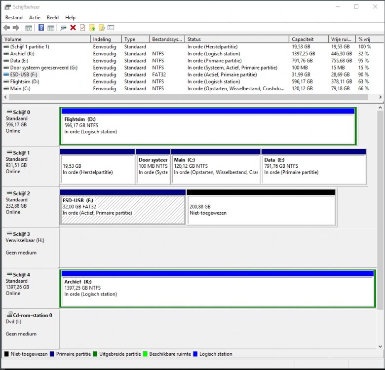 Hey! Goeie namiddag allebei! Hey! Passer en Porrelaar, Jullie uitleg is deels niet begrijpbaar voor me, de reden is dat ik niet zoveel als jullie ken over computers... Maar een en ander wat jullie vertellen klopt volgens mij toch ook niet helemaal met wat ik deze dagen gedaan heb.... - aan mijn C heb ik sinds jààren van het bestaan van mijn pc niets meer veranderd. Als die nu op schijf 1 staat, dan zal dat van in 't beging zo geweest zijn toen ik die pc aangekocht heb. OF... Ik heb ooit, onder Windows XP mogelijk nog, met PartitionMagic zelf die partities verwisseld, maar dat herinner ik me niet helemaal juist meer, omdat ik één relatief grote interne drive wilde hebben voor mijn FlightSimulator, en dat is nog steeds die drive D, omdat die ca.600Gb was, en die zat in de pc-kast in als eerste schijf 0 met C erop. Voor mij was het beter één grotere schijf te hebben Dat is zo gebleven sinds die tijd. Tenminste kan ik zeggen: ik heb daar achteraf niets meer aan veranderd. En dan heb ik mogekijk zelf die schijf1 als mijn C genomen, , ca 120 Gb, dat was voldoende voor de basisprogramma's en wat kleinere andere programs. Alleszins, dat heeft steeds zo gewerkt, en goed! - ik heb 2 interne schijven en 2 externe schijven Zeker mijn schijf 1, waarop dus mijn C staat, en mijn scijf 0, waarop mijn D staat van de FlightSimulator zijn beide interne schijven. Op de schijf 1 heb ik dan wat plaats gegeven voor allerlei data, en die twee andere partities die heeft het pc-programma zelf aangemaakt. De andere twee schijven, 2 en 3, die heb later zelf aangesloten, één voor het bewaren van belangrijke gegevens , en dat zijn mijn F geworden, op schijf 2, en mijn K op schijf 3 ( die is nu blijkbaar 4 geworden, ik weet niet waarom en hoe ). Als ik dat zo bekijk, dan merk ik op dat alleen van mijn schijf 2, vermoedelijk door die USB-werking bij het heropstarten van Windows 10, een deel afgepikt, en daar werd hetzelfde opgezet als wat op de USB zelf ook al staat, én, im welke reden, dat weet ik ook niet, heeft die dat stuk in een aparte partitie gezet, die eerst FAT-geformatteerd werd. FAT had ik al lang afgeschreven en alles is bij mij al lang NTFS geformatteerd. Het usb-programmaatje heeft de rest van de schijf 2, mijn gewezen F, laten staan, hopelijk en in een afzonderlijke partitie laten staan. Als dit laatste klopt, dan staat daar mogelijk tenminste nog een deel op van mijn oorspronkelijke F. Dus moet ik dat stuk dan nu niet toegewezen is, op een of andere manier proberen te zien te krijgen. Als ik dat zou kunnen toewijzen aan een nog niet bestaande letter, dan ligt de weg voor mij open om opnieuw te beginnen met schone lei... Wat denken jullie daarvan? Noteer ook: ik heb de herinstallatie van Windows 10 slechts éénmal uitgevoerd, waardoor ik in deze situatie ben terechtgekomen, ok had daarvoor ook slechts één USB-stick gebruikt, en maar éénmaal gedownload. Wel heb ik datzelfde in 2 vorige acties al eens gedaan, en toen liep alles perfect. Graag uw mening. Jive1 - Belgium