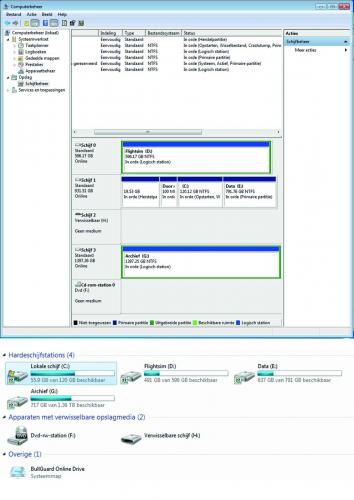 8. Hey! Goeie morgen, Ik heb 4 harde schijven op mijn PC, 2 ingebouwde en 2 externe. De gebruikte letters zijn momenteel C - D - E - G ( C en E zijn 2 partities op één schijf ). Normaal was er ook nog een J gebruikt, 5 partities alles amen dus. Ik weet niet meer hoe het komt dat F en I ontbreken, dat is iets dat lange tijd geleden gebeurd is, maar dat is niet het probleem. Het is die J die ik voorlopig niet meer terugvind. En daar staan alleen zaken op die ik absoluut niet mag kwijtspelen. Maar ik heb daarvan nu wel iets nodig. Zie in bijlage een beeld van de schijvensituatie. Schijf 2 staat daar "leeg" aangegeven, en zou verwisselbaar zijn. Ik vermoed echter dat het mijn schijf J moet zijn, een van, als ik het goed voorheb, ca. 100GB Hoe kan ik mijn schijf J terugvinden ( mag ook F worden in plaats van J )? Groeten Jive1 - Belgium