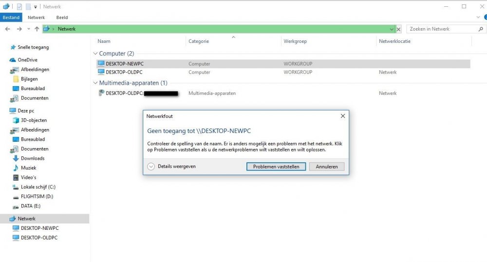 Hey! Stegisoft, Wat ik ook probeer van die acties die u me aanraadt, of ook van wat ik lees op Internet, niets helpt om mijn beide pc's elkaars bestanden efficient en stabiel te laten zien op telkens één privé gedeelde drive met volledig beheer voor elkaar beschikbaar te hebben. Ik lees op Internet op verschillende plaatsen dat die fout bij Windows 10 nogal veel voorkomt. MS zou daar zelfs ergens een update voor hebben, maar de link daarnaar om die bij mij te installeren, vind ik nergens... Raar is, dat ik eigenlijk tot voor kort wél kon copy/pasten van de ene naar de andere. Ik weet echter niet wanneer deze huidige situatie is begonnen, of het bij een MS upgrade of een of andere foute actie van mezelf is begonnen... Moet ik een nieuwe werkgroep aanmaken?... Groeten Jive1 - Belgium -