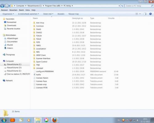 Pc Veilig staat nog steeds bij de program files, met alles erin ik weet niet of er nog processen van bezig zijn Hier is een tasklist, misschien dat je het daar in kan vinden: Imagenaam Proces-i Sessienaam Sessienr. Geheugengebr ========================= ======== ================ =========== ============ System Idle Process 0 Services 0 24 kB System 4 Services 0 1.892 kB smss.exe 312 Services 0 1.180 kB csrss.exe 448 Services 0 5.120 kB wininit.exe 516 Services 0 5.360 kB csrss.exe 532 Console 1 18.588 kB services.exe 568 Services 0 11.304 kB lsass.exe 584 Services 0 14.212 kB lsm.exe 592 Services 0 5.144 kB winlogon.exe 648 Console 1 8.012 kB svchost.exe 740 Services 0 10.352 kB svchost.exe 836 Services 0 9.272 kB atiesrxx.exe 884 Services 0 4.948 kB svchost.exe 964 Services 0 23.808 kB svchost.exe 1008 Services 0 180.328 kB svchost.exe 240 Services 0 37.472 kB svchost.exe 1032 Services 0 16.744 kB atieclxx.exe 1096 Console 1 7.316 kB SbieSvc.exe 1112 Services 0 4.596 kB Pen_TouchService.exe 1240 Services 0 5.664 kB wisptis.exe 1252 Console 1 9.260 kB svchost.exe 1500 Services 0 16.352 kB wisptis.exe 1656 Console 1 12.436 kB TabTip.exe 1668 Console 1 15.668 kB AvastSvc.exe 1732 Services 0 49.580 kB TabTip32.exe 1764 Console 1 3.344 kB dwm.exe 1816 Console 1 7.608 kB explorer.exe 1864 Console 1 76.396 kB Pen_TouchUser.exe 1884 Console 1 12.100 kB RAVCpl64.exe 624 Console 1 14.508 kB spoolsv.exe 2180 Services 0 12.760 kB taskhost.exe 2196 Console 1 10.040 kB svchost.exe 2272 Services 0 21.732 kB svchost.exe 2300 Services 0 19.552 kB PhotoshopElementsFileAgen 2416 Services 0 992 kB FsUsbExService.Exe 2636 Services 0 5.548 kB LSSrvc.exe 2688 Services 0 4.720 kB RichVideo.exe 2744 Services 0 4.708 kB svchost.exe 2792 Services 0 6.412 kB Pen_Tablet.exe 2844 Services 0 6.744 kB WLIDSVC.EXE 2908 Services 0 16.400 kB Pen_TabletUser.exe 3000 Console 1 6.868 kB AvastUI.exe 3044 Console 1 4.668 kB MOM.exe 2460 Console 1 6.764 kB Pen_Tablet.exe 2596 Console 1 20.232 kB SearchIndexer.exe 3100 Services 0 24.324 kB WLIDSVCM.EXE 3352 Services 0 4.040 kB CCC.exe 3536 Console 1 24.164 kB svchost.exe 3704 Services 0 6.416 kB wmpnetwk.exe 3756 Services 0 12.876 kB svchost.exe 2496 Services 0 12.632 kB PresentationFontCache.exe 4900 Services 0 18.544 kB svchost.exe 3052 Services 0 29.568 kB InputPersonalization.exe 3272 Console 1 528 kB svchost.exe 4480 Services 0 4.780 kB taskhost.exe 4756 Services 0 3.840 kB audiodg.exe 4984 Services 0 18.264 kB Setup.exe 1576 Console 1 6.460 kB is-12IQ7.tmp 4380 Console 1 45.408 kB firefox.exe 1420 Console 1 133.456 kB msnmsgr.exe 4780 Console 1 121.512 kB wlcomm.exe 2592 Console 1 24.372 kB plugin-container.exe 1648 Console 1 16.432 kB cmd.exe 3132 Console 1 3.456 kB conhost.exe 3780 Console 1 7.348 kB tasklist.exe 3664 Console 1 6.604 kB WmiPrvSE.exe 1640 Services 0 7.248 kB -