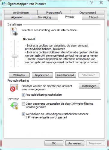 Hoi Nenna, Malware of virussen zijn dus al uitgesloten wat betreft de oorzaak Ga naar Start - Configuratiescherm - Internetopties (indien je dit niet terug vind kies je voor de klassieke weergave) Ga naar het tabblad Privacy Op welke waarde staat de schuifbalk onder Instellingen?