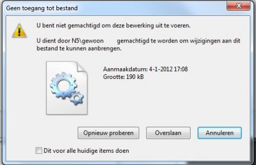 1. hallo, In windows 7 wil ik een bestand wijzigen in program files x86 Maar krijg een foutmelding( zie afbeelding. Dit gebeurt steeds en ben zowel eigenaar als bevoegd en het is ingesteld als beheerdersaccount om dit te veranderen. Mijn computernaam is N5 en gebruikersnaam gewoon. Het zit niet in de map of bovenliggende mappen, ben overal eigenaar. Maar op een of andere manier niet meer gemachtigd voor het wijzigen ervan. Hoe kan ik weer machtiging krijgen tot het wijzigen van program files x86? alvast bedankt!