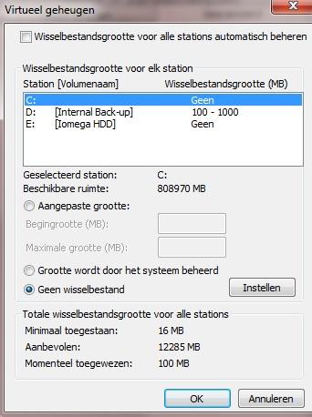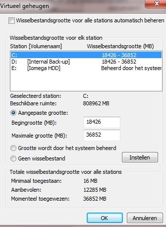 Heb ik ook al meermaals geprobeerd. hierbij screenshot van instellingen virtueel geheugen. in mijn geheugen komt het over alsof mijn pc weet dat ik hem dit heb toegewezen, maar dat hij zich bij zijn eigen (standaard) 6gb houdt (zowel min als max; geheugen varieert met maar 100mb) minimum toegewezen geheugen is 18gb nog iets raar: - ik start pc op - virtueel geheugen staat nu op net geen 6gb - start alwaysync (back-upprogramma), virtueel geheugen krimpt tijdens back-up - ik stop het programma wanneer er nog maar 703mb vrij is - na afsluiten programma zakt het vrije geheugen maar tot 752mb, de rest blijft in de cache hangen - programma staat volledig uit (niet meer te bespeuren in tabblad processen bij taakbeheer)
