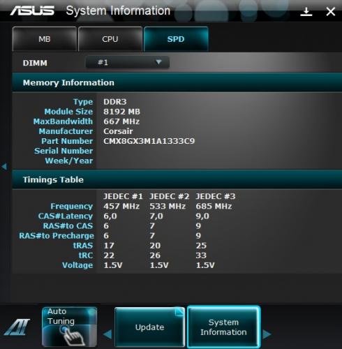 Hallo, overlaatst heb ik me een setje Corsair ram geheugen aangeschaft voor op mijn Asus p8h61-m pro moederbord. wat me echter verbaast is dat er bij "system information" via een Asus-tool staat dat de max bandwidth slechts 667mHz is. het moederbord zou echter 1333mHz moeten ondersteunen ( ASUS - Motherboards- ASUS P8H61-M PRO ) op de foto kan je zien wat het Asus-tooltje weergeeft. In de pc zitten 2 van deze latjes, samen goed voor 16gb heeft iemand een oplossing hiervoor? alvast bedankt! -