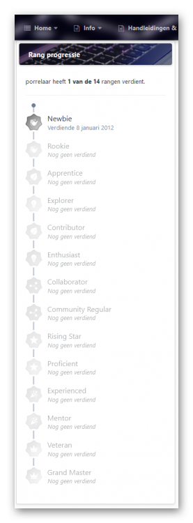 21. Toen ik vandaag inlogde op het forum, kreeg ik een melding: Ik had de 'One Year In' badge verdient (ja, dat staat er met een t...): En ik was Newbie geworden, de eerste van maar liefst 14 rangen. En die rang van Newbie zou ik verdiend hebben omdat ik 1 jaar lid ben van dit forum. Eén jaar? Volgens mij is dat eerder 9½ jaar, want ik ben lid geworden op 8 januari 2012. Jeetje, na 9½ jaar lid te zijn en meer dan 3.000 berichten heb ik nu dus al de rang van Newbie bereikt. Ik bevind me echter in goed gezelschap, want ook een gewaardeerd lid als clarkie blijkt Newbie te zijn. Karel, het allereerste lid van dit forum, heeft al rang 2 bereikt: Rookie: Ik vrees dat ik zo oud als Methusalem moet worden om ooit de rang van Collaborator (= rang 7) te bereiken. Overigens doet dat me toch te veel denken aan het woord collaborateur, iemand die heel erg fout was in de oorlog. Is dit een probeersel of wordt dit rangen- en standensysteem echt doorgezet? Het doet me een beetje denken aan de titels op helpmij.nl, waar ik af en toe in de lach schiet door titels als Tera Honourable Senior Member. Ik heb nog een lange weg te gaan...