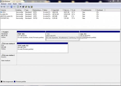 met de het progamma op windwos 7 kan je partities maken en formateren ,, ik heb de schijf: D: verkleind nu heb ik een stuk ruimte eraf gehaald en daarmee kan je de schijven mee vergroten maar de C: schijf kan ik niet uitbreiden met die apart gezetten ruimte