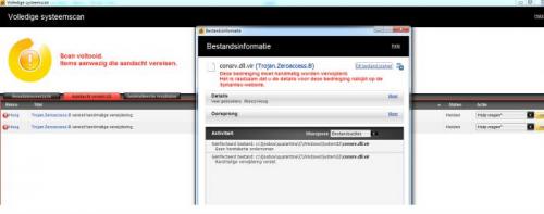 Verslag van combofix : ComboFix 12-02-19.02 - Asus 20/02/2012 10:26:35.2.4 - x64 NETWORK Microsoft Windows 7 Home Premium 6.1.7601.1.1252.32.1043.18.4008.3437 [GMT 1:00] Gestart vanuit: c:\users\Asus\Desktop\ComboFix.exe gebruikte Opdracht switches :: c:\users\Asus\Desktop\CFScript.txt AV: Norton AntiVirus *Enabled/Updated* {63DF5164-9100-186D-2187-8DC619EFD8BF} SP: Norton AntiVirus *Enabled/Updated* {D8BEB080-B73A-17E3-1B37-B6B462689202} SP: Windows Defender *Disabled/Updated* {D68DDC3A-831F-4fae-9E44-DA132C1ACF46} * Nieuw herstelpunt werd aangemaakt . . (((((((((((((((((((((((((((((((((( Andere Verwijderingen ))))))))))))))))))))))))))))))))))))))))))))))))) . . c:\windows\assembly\GAC_32\Desktop.ini c:\windows\assembly\GAC_64\Desktop.ini c:\windows\assembly\temp\@ c:\windows\assembly\temp\cfg.ini c:\windows\system32\consrv.dll . . (((((((((((((((((((( Bestanden Gemaakt van 2012-01-20 to 2012-02-20 )))))))))))))))))))))))))))))) . . 2012-02-19 17:08 . 2012-02-19 17:08 -------- d-----w- c:\users\Asus\AppData\Roaming\Malwarebytes 2012-02-19 17:08 . 2012-02-19 17:08 -------- d-----w- c:\programdata\Malwarebytes 2012-02-19 17:08 . 2012-02-19 17:08 -------- d-----w- c:\program files (x86)\Malwarebytes' Anti-Malware 2012-02-19 17:08 . 2011-12-10 14:24 23152 ----a-w- c:\windows\system32\drivers\mbam.sys 2012-02-19 16:54 . 2012-02-19 16:54 -------- d-----w- c:\users\Asus\AppData\Local\ElevatedDiagnostics 2012-02-19 13:45 . 2012-02-19 13:45 -------- d-----w- c:\users\Asus\AppData\Roaming\Tific 2012-02-19 13:45 . 2012-02-19 13:45 -------- d-----w- c:\users\Asus\AppData\Local\Symantec 2012-02-19 13:43 . 2012-02-20 09:22 0 --sha-w- c:\windows\system32\dds_trash_log.cmd 2012-02-15 12:48 . 2012-01-04 10:44 509952 ----a-w- c:\windows\system32\ntshrui.dll 2012-02-15 12:48 . 2012-01-04 08:58 442880 ----a-w- c:\windows\SysWow64\ntshrui.dll 2012-02-15 12:48 . 2011-12-30 06:26 515584 ----a-w- c:\windows\system32\timedate.cpl 2012-02-15 12:48 . 2011-12-30 05:27 478720 ----a-w- c:\windows\SysWow64\timedate.cpl 2012-02-15 12:48 . 2012-01-14 04:06 3145728 ----a-w- c:\windows\system32\win32k.sys 2012-02-15 12:48 . 2011-12-28 03:59 498688 ----a-w- c:\windows\system32\drivers\afd.sys 2012-02-15 12:47 . 2011-12-16 08:46 634880 ----a-w- c:\windows\system32\msvcrt.dll 2012-02-15 12:47 . 2011-12-16 07:52 690688 ----a-w- c:\windows\SysWow64\msvcrt.dll 2012-02-12 20:43 . 2012-02-12 20:43 -------- d-----w- c:\program files\Common Files\Deterministic Networks 2012-02-12 20:43 . 2012-02-12 20:43 -------- d-----w- c:\program files (x86)\Cisco Systems 2012-01-31 16:17 . 2012-02-10 07:32 -------- d-----w- c:\windows\system32\drivers\NAVx64\1207000.00D . . . ((((((((((((((((((((((((((((((((((((((( Find3M Rapport )))))))))))))))))))))))))))))))))))))))))))))))))))) . . . ((((((((((((((((((((((((((((( SnapShot@2012-02-19_20.46.05 ))))))))))))))))))))))))))))))))))))))))) . - 2009-07-14 04:54 . 2012-02-19 19:25 16384 c:\windows\SysWOW64\config\systemprofile\AppData\Roaming\Microsoft\Windows\Cookies\index.dat + 2009-07-14 04:54 . 2012-02-19 20:57 16384 c:\windows\SysWOW64\config\systemprofile\AppData\Roaming\Microsoft\Windows\Cookies\index.dat + 2009-07-14 04:54 . 2012-02-19 20:57 32768 c:\windows\SysWOW64\config\systemprofile\AppData\Local\Microsoft\Windows\Temporary Internet Files\Content.IE5\index.dat - 2009-07-14 04:54 . 2012-02-19 19:25 32768 c:\windows\SysWOW64\config\systemprofile\AppData\Local\Microsoft\Windows\Temporary Internet Files\Content.IE5\index.dat - 2009-07-14 04:54 . 2012-02-19 19:25 16384 c:\windows\SysWOW64\config\systemprofile\AppData\Local\Microsoft\Windows\History\History.IE5\index.dat + 2009-07-14 04:54 . 2012-02-19 20:57 16384 c:\windows\SysWOW64\config\systemprofile\AppData\Local\Microsoft\Windows\History\History.IE5\index.dat + 2010-11-21 03:09 . 2012-02-19 20:53 44088 c:\windows\system32\wdi\ShutdownPerformanceDiagnostics_SystemData.bin + 2009-07-14 05:10 . 2012-02-19 20:54 35250 c:\windows\system32\wdi\BootPerformanceDiagnostics_SystemData.bin - 2012-02-19 14:09 . 2012-02-19 17:22 67584 c:\windows\system32\LogFiles\Srt\bootstat.dat + 2012-02-19 14:09 . 2012-02-20 09:14 67584 c:\windows\system32\LogFiles\Srt\bootstat.dat + 2011-05-18 12:10 . 2012-02-20 09:22 16384 c:\windows\system32\config\systemprofile\AppData\Roaming\Microsoft\Windows\Cookies\index.dat - 2011-05-18 12:10 . 2012-02-19 13:58 16384 c:\windows\system32\config\systemprofile\AppData\Roaming\Microsoft\Windows\Cookies\index.dat + 2011-05-18 12:10 . 2012-02-20 09:22 32768 c:\windows\system32\config\systemprofile\AppData\Local\Microsoft\Windows\Temporary Internet Files\Content.IE5\index.dat - 2011-05-18 12:10 . 2012-02-19 13:58 32768 c:\windows\system32\config\systemprofile\AppData\Local\Microsoft\Windows\Temporary Internet Files\Content.IE5\index.dat - 2009-07-14 04:54 . 2012-02-19 13:58 16384 c:\windows\system32\config\systemprofile\AppData\Local\Microsoft\Windows\History\History.IE5\index.dat + 2009-07-14 04:54 . 2012-02-20 09:22 16384 c:\windows\system32\config\systemprofile\AppData\Local\Microsoft\Windows\History\History.IE5\index.dat + 2011-05-18 12:21 . 2012-02-19 20:54 6718 c:\windows\system32\wdi\{86432a0b-3c7d-4ddf-a89c-172faa90485d}\S-1-5-21-2765547659-3389848668-315783056-1000_UserData.bin + 2009-07-13 23:31 . 2009-07-14 01:39 6656 c:\windows\system32\racsvc.dll - 2012-02-19 20:45 . 2012-02-19 20:45 2048 c:\windows\ServiceProfiles\LocalService\AppData\Local\lastalive1.dat + 2012-02-20 09:29 . 2012-02-20 09:29 2048 c:\windows\ServiceProfiles\LocalService\AppData\Local\lastalive1.dat - 2012-02-19 20:45 . 2012-02-19 20:45 2048 c:\windows\ServiceProfiles\LocalService\AppData\Local\lastalive0.dat + 2012-02-20 09:29 . 2012-02-20 09:29 2048 c:\windows\ServiceProfiles\LocalService\AppData\Local\lastalive0.dat + 2010-11-21 16:48 . 2012-02-19 20:57 701798 c:\windows\system32\perfh013.dat + 2009-07-14 02:36 . 2012-02-19 20:57 616242 c:\windows\system32\perfh009.dat + 2010-11-21 16:48 . 2012-02-19 20:57 133798 c:\windows\system32\perfc013.d