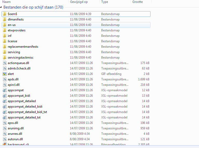 Ik heb de usb stick met windows 7 nogmaals aangemaakt. Maar het is weer niet gelukt om windows 7 op de pc te installeren. Op de usb stick staat er maar 1, 08Gb. Alle mappen staan erop behalve "setup". Als ik vb de map "sources" vergelijk, dan staat er ook niet alles op de usb stick, enkel de gele mappen (zie print screen). Ik heb opgemerkt dat bij het installeren van de usb stick met Win to flash bij de allerlaatste stap wanneer de usb stick aangemaakt is, het volgende is aangevinkt: "remove the read only attribute from files" (zie print screen). Ik zie echter geen mogelijkheid om dit af te vinken bij de eerste stap. Als ik de windows 7 dvd in de dvd drive stop van de pc waarop ik windows wil installeren, wordt deze niet herkend. Als ik deze in mijn laptop steek zie ik wel alle bestanden (zie print screen).