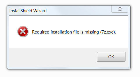 10. Ja het opent zich, maar na de taalkeuze verschijnt het bericht Required installation file is missing (7z.exe), in het InstallShield Wizard-venster.