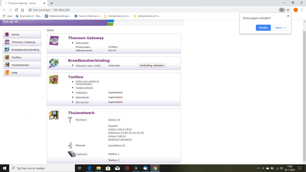 Home Thomson Gateway Breedbandverbinding Toolbox Thuisnetwerk Apparaten Interfaces Help Home > Thuisnetwerk Thuisnetwerk Wireless WLAN: Thomson309B22 (13Mbps) DESKTOP-NEHS6TH UPnP MediaServer Unknown-bc-a5-8b-36-97-d2 Galaxy-Tab-A-2016 Galaxy-Tab-S2 Unknown-74-da-38-3e-54-40 Ethernet ethport1 (100Mbps) VanAlphen-PC ethport2 (100Mbps) ethport3 (100Mbps) ethport4 (100Mbps) Telefonie Telefoon 1 Telefoon 1 Telefoon 2 Telefoon 2