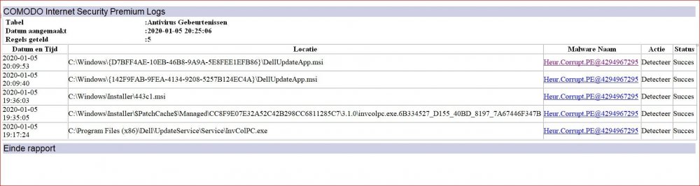Willen jullie even wachten met dit probleem te bekijken? Ik heb ontdekt dat er een nieuwere versie van Comodo was, die blijkbaar niet geïnstalleerd was alhoewel het ingesteld staat om automatisch te updaten. Na installatie nieuwe versie gaf de scan deze meldingen niet meer. Maar het zou kunnen dat het is omdat de malware ergens opzij gezet is. Ik heb een week geleden Chrome geïnstalleerd ter vervanging van Firefox maar werk er niet zo graag mee en ik heb de indruk dat het systeem sindsdien trager is. Ik ga terugkeren naar Image van voor de installatie en ga dan nieuwe scan laten lopen.
