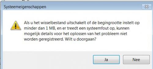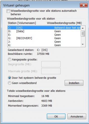 Ik zie dat op mijn laptop het vinkje bovenaan geplaatst is maar op mijn desktop (waar ik dus de boodschap kreeg) niet. Wel is de rest zoals je beschreef - zie bijlage. Dus moet ik niets veranderen? Maar iets anders : Ik heb bij de herinstallatie van mijn PC's steeds het stappenplan van Schoone PC gevolgd. Ik dacht dat daar werd aangeraden het wisselbestand een vaste grootte te geven. Je moet dan dezelfde begin en eindgrootte instellen. Hij raadt dit aan omdat het wisselbestand dan niet gefragmenteerd wordt (logisch - je geeft een vaste ruimte) Raar dat dit noch op mijn pc noch op mijn laptop zo ingesteld staat. Wat is jouw idee daarover? Welke grootte nemen? Aanbevolen grootte is 4603Mb -