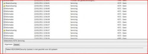 Hi Asus, Bij mij staan alle updates als zijnde van 8/2. Ik krijg die melding voor alle updates, die ik in mijn eerste bericht toon. Ik was intussen al begonnen met de updates stuk per stuk te installeren. Zo installeerde ik KB2419640 al voor ik de afbeelding uit mijn eerste bericht maakte. Dit is een schermafbeelding van mijn Windows logboek De 3 waarschuwingen gaan allemaal over - KB2419640 en zeggen allemaal hetzelfde (zie onderaan) Ben intussen ook met Microsoft hierover bezig. Die antwoorden mij gewoon dat al de updates wel geschikt zijn voor mijn systeem. Heb hen daarop dezelfde schermafbeelding gestuurd met de vraag waarom ik dan dergelijke dingen in het logboek vind. Schoonmaken met CCleaner doe ik regelmatig.