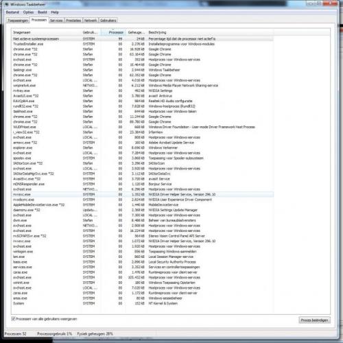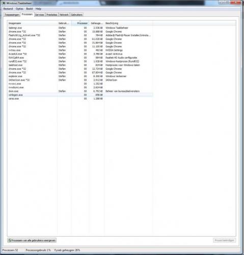 Ik heb dit al vaak geprobeerd. Op het moment dat de computer vastloopt wilt taakbeheer ook niet meer starten. Dus heb ik het vooraf al gestart om dan gewoon te kunnen switchen. Maar er is gewoon geen enkel programma dat veel CPU of geheugen verbruikt op dat moment, en ik heb dit echt al vele tientallen keren gecontroleerd, zelfs vaak voordat ik de computer helemaal herinstalleerd heb. Ziehier de screenshot. Wat wel interessant kan zijn (en dat merk ik nu voor het eerst), dat is dat een paar minuten later, op het moment dat de computer weer in gang schiet, er plots in taakbeheer een lijn is met 'niet actieve processen'. Deze lijn is er niet op het moment dat hij vastloopt. Hier dus een screenshot van vlak na het vastlopen: