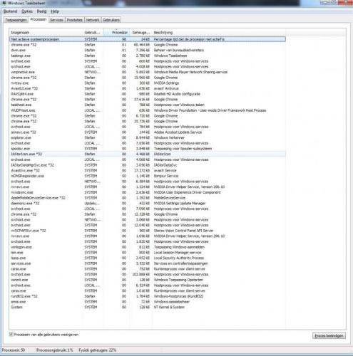 Te vroeg victorie gekraaid. De PC loopt nu soms meerdere uren zonder problemen, maar vooral net na de opstart loopt hij toch nog vaak vaak vast, en op de taskmanager is gewoon niets te zien. Ik heb de indruk dat hij vooral vastloopt als ik iets doe dat een internetverbinding vereist (ter info, mijn verbinding is erg traag, maar dat mag toch geen oorzaak zijn dat mijn pc vastloopt, op dezelfde verbinding heeft mijn laptop die ook windows 7 is helemaal geen probleem.