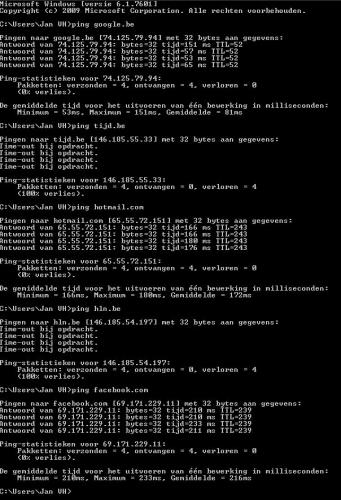Sites als google, facebook en dergelijke werken aan een aanvaardbare snelheid. Sites van kranten zoals hln.be, standaard.be, tijd.be zijn een hel om te laden (duurt 20 sec en meer). Ik heb daar eens de ping van proberen te meten en het geeft bij allemaal de melding: "time-out bij opdracht". Ook als ik nytimes.com probeer is dit hetzelfde Op speedtest.net is mijn algemene ping nog steeds 1820 ms..