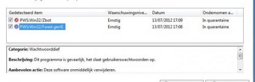 Microsoft Security Essentials vind dingenJerser plaatste een topic in Archief Bestrijding malware & virussen Beste, Ik zag weer eens op mijn computer dat oranje dingetje staan van dat m'n computer niet beveiligd was... Ik dacht, nou ja, ik zal eens kijken he. Hetzelfde, je moet hem laten scannen, maar na 2 dagen geeft ie weer hetzelfde. Dus ik kijk eens bij wat er in quarantaine staat. En toen schrok ik. 2 dingen die aangeduid worden als wachtwoorddief. Hieronder een screen van de gevonden virussen. Moet ik deze verwijderen? Hierbij ook een Hijackthis log. Hier de hijackthis log. Logfile of Trend Micro HijackThis v2.0.4 Scan saved at 20:03:01, on 16/07/2012 Platform: Windows 7 SP1 (WinNT 6.00.3505) MSIE: Internet Explorer v9.00 (9.00.8112.16447) Boot mode: Normal Running processes: C:\Program Files (x86)\Evernote\Evernote\EvernoteClipper.exe C:\Program Files\ASUS\TurboV EVO\TurboV_EVO.exe C:\Program Files (x86)\ASUS\EPU\EPU.exe C:\Program Files (x86)\DeviceVM\Browser Configuration Utility\BCU.exe C:\Program Files (x86)\Renesas Electronics\USB 3.0 Host Controller Driver\Application\nusb3mon.exe C:\Program Files (x86)\iTunes\iTunesHelper.exe C:\Program Files (x86)\Common Files\Java\Java Update\jusched.exe C:\Program Files (x86)\Internet Explorer\IELowutil.exe C:\Program Files (x86)\Windows Live\Messenger\msnmsgr.exe C:\Program Files (x86)\Windows Live\Contacts\wlcomm.exe C:\Windows\SysWOW64\Macromed\Flash\FlashUtil32_11_2_202_235_ActiveX.exe C:\Program Files (x86)\Internet Explorer\iexplore.exe C:\Program Files (x86)\Internet Explorer\iexplore.exe C:\Program Files (x86)\Windows Live\Companion\companionuser.exe C:\Program Files (x86)\Trend Micro\HiJackThis\HiJackThis.exe R1 - HKCU\Software\Microsoft\Internet Explorer\Main,Search Page = Bing R0 - HKCU\Software\Microsoft\Internet Explorer\Main,Start Page = Google R1 - HKLM\Software\Microsoft\Internet Explorer\Main,Default_Page_URL = Hotmail, Messenger, het laatste nieuws en entertainment | MSN.NL R1 - HKLM\Software\Microsoft\Internet Explorer\Main,Default_Search_URL = Bing R1 - HKLM\Software\Microsoft\Internet Explorer\Main,Search Page = Bing R0 - HKLM\Software\Microsoft\Internet Explorer\Main,Start Page = Hotmail, Messenger, het laatste nieuws en entertainment | MSN.NL R0 - HKLM\Software\Microsoft\Internet Explorer\Search,SearchAssistant = R0 - HKLM\Software\Microsoft\Internet Explorer\Search,CustomizeSearch = R0 - HKLM\Software\Microsoft\Internet Explorer\Main,Local Page = C:\Windows\SysWOW64\blank.htm R1 - HKCU\Software\Microsoft\Windows\CurrentVersion\Internet Settings,ProxyOverride = *.local F2 - REG:system.ini: UserInit=userinit.exe, O2 - BHO: AcroIEHelperStub - {18DF081C-E8AD-4283-A596-FA578C2EBDC3} - C:\Program Files (x86)\Common Files\Adobe\Acrobat\ActiveX\AcroIEHelperShim.dll O2 - BHO: Java Plug-In SSV Helper - {761497BB-D6F0-462C-B6EB-D4DAF1D92D43} - C:\Program Files (x86)\Java\jre6\bin\ssv.dll O2 - BHO: Aanmeldhulp voor Windows Live ID - {9030D464-4C02-4ABF-8ECC-5164760863C6} - C:\Program Files (x86)\Common Files\Microsoft Shared\Windows Live\WindowsLiveLogin.dll O2 - BHO: Windows Live Messenger Companion Helper - {9FDDE16B-836F-4806-AB1F-1455CBEFF289} - C:\Program Files (x86)\Windows Live\Companion\companioncore.dll O2 - BHO: Java Plug-In 2 SSV Helper - {DBC80044-A445-435b-BC74-9C25C1C588A9} - C:\Program Files (x86)\Java\jre6\bin\jp2ssv.dll O4 - HKLM\..\Run: [HDAudDeck] C:\Program Files (x86)\VIA\VIAudioi\VDeck\VDeck.exe -r O4 - HKLM\..\Run: [TurboV EVO] "C:\Program Files\ASUS\TurboV EVO\TurboV_EVO.exe" -b O4 - HKLM\..\Run: [six Engine] "C:\Program Files (x86)\ASUS\EPU\EPU.exe" -b O4 - HKLM\..\Run: [bCU] "C:\Program Files (x86)\DeviceVM\Browser Configuration Utility\BCU.exe" O4 - HKLM\..\Run: [NUSB3MON] "C:\Program Files (x86)\Renesas Electronics\USB 3.0 Host Controller Driver\Application\nusb3mon.exe" O4 - HKLM\..\Run: [startCCC] "C:\Program Files (x86)\ATI Technologies\ATI.ACE\Core-Static\CLIStart.exe" MSRun O4 - HKLM\..\Run: [Adobe ARM] "C:\Program Files (x86)\Common Files\Adobe\ARM\1.0\AdobeARM.exe" O4 - HKLM\..\Run: [APSDaemon] "C:\Program Files (x86)\Common Files\Apple\Apple Application Support\APSDaemon.exe" O4 - HKLM\..\Run: [iTunesHelper] "C:\Program Files (x86)\iTunes\iTunesHelper.exe" O4 - HKLM\..\Run: [sunJavaUpdateSched] "C:\Program Files (x86)\Common Files\Java\Java Update\jusched.exe" O4 - HKCU\..\Run: [YouTube Mini] C:\Program Files (x86)\YoutubeDownloader.org\YouTubeDownloader\YouTube Mini.exe O4 - HKCU\..\Run: [DAEMON Tools Lite] "C:\Program Files (x86)\DAEMON Tools Lite\DTLite.exe" -autorun O4 - Startup: EvernoteClipper.lnk = C:\Program Files (x86)\Evernote\Evernote\EvernoteClipper.exe O8 - Extra context menu item: Add to Evernote 4.0 - res://C:\Program Files (x86)\Evernote\Evernote\EvernoteIE.dll/204 O8 - Extra context menu item: E&xporteren naar Microsoft Excel - res://C:\PROGRA~2\MICROS~4\OFFICE11\EXCEL.EXE/3000 O8 - Extra context menu item: Free YouTube to MP3 Converter - C:\Users\Luc\AppData\Roaming\DVDVideoSoftIEHelpers\freeyoutubetomp3converter.htm O9 - Extra button: @C:\Program Files (x86)\Windows Live\Companion\companionlang.dll,-600 - {0000036B-C524-4050-81A0-243669A86B9F} - C:\Program Files (x86)\Windows Live\Companion\companioncore.dll O9 - Extra button: @C:\Program Files (x86)\Windows Live\Writer\WindowsLiveWriterShortcuts.dll,-1004 - {219C3416-8CB2-491a-A3C7-D9FCDDC9D600} - C:\Program Files (x86)\Windows Live\Writer\WriterBrowserExtension.dll O9 - Extra 'Tools' menuitem: @C:\Program Files (x86)\Windows Live\Writer\WindowsLiveWriterShortcuts.dll,-1003 - {219C3416-8CB2-491a-A3C7-D9FCDDC9D600} - C:\Program Files (x86)\Windows Live\Writer\WriterBrowserExtension.dll O9 - Extra button: Onderzoek - {92780B25-18CC-41C8-B9BE-3C9C571A8263} - C:\PROGRA~2\MICROS~4\OFFICE11\REFIEBAR.DLL O10 - Unknown file in Winsock LSP: c:\program files (x86)\common files\microsoft shared\windows live\wlidnsp.dll O10 - Unknown file in Winsock LSP: c:\program files (x86)\common files\microsoft shared\windows live\wlidnsp.dll O