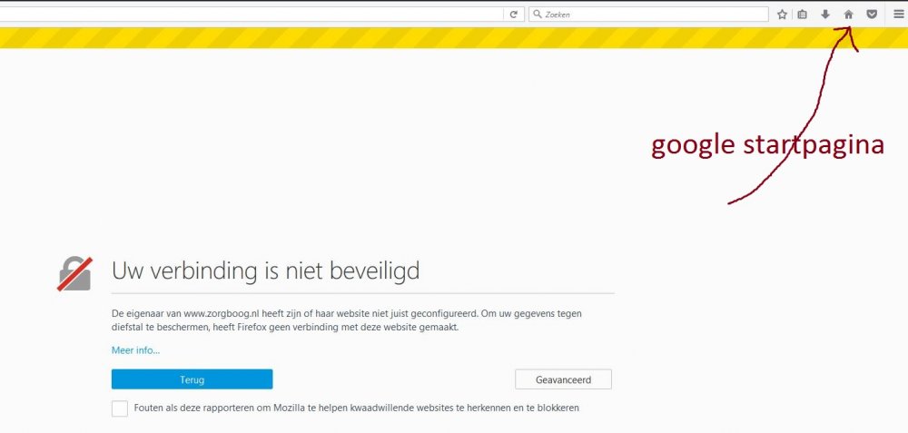 ik gebruik mozille firefox dat had je al gezien die heb ik in de onder taakbalk zitten klik op het icoon en geeft aan u heeft een onbeveiligde verbinding dan ga ik (zie afbeelding) naar huisje bovenin en kom ik op google zoeksite heb ik zelf ingesteld natuurlijk dan kan ik sommige websites bereiken maar b.v. het cliëntenportaal van mijn moeder niet daar kan ik al vanaf donderdag niet meer in volgens mij werkt de Gmail ook nog niet naar behoren kortom nog dezelfde problemen heb zojuist de update van windows gedaan doordat het systeemherstel naar een eerdere datum was gegaan en dit is dus gewoon gelukt. nu heb ik juist geprobeerd met internet explorer die geeft volgens mij tot nu toe geen problemen daarmee kan ik bv wel naar het cliëntenportaal daarin zie ik ook mijn favorieten weer staan en niet in firefox was ik juist van explorer af en vond het prettig met mozilla firefox en krijg je dit weer in mozilla firefox had ik inmiddels ook favorieten staan maar zijn niet zichtbaar