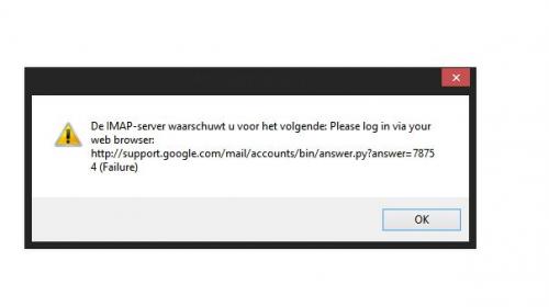 Hoi Clarkie, dank voor je reactie, ik heb dit al eerder helemaal doorlopen. maar werkt niet. Ik heb op mijn pc W.8.1 outlook 13 en daar had ik al mijn mails in ondergebracht ook de Gmail was allemaal oke werkte perfect totdat ik mijn wachtoord moest veranderen i.v.m. evt. hackers vanalles geprobeerd maar nee dus Gmail er af gehaald verwijderd en daarna opnieuw geprobeerd om hem weer er in te zetten maar is niet gelukt hij zoekt en zoekt maar kom niet verder en dat is geen probleem want ik kan hem online gewoon bekijken hij hoeft er ook niet perse in dus dat is 't probleem nu niet maar bovenstaande bijlage zeer irritant als ik outlook open komen steeds deze berichten omdat waarschijnlijk hij toch telkens zoekt naar de berichten van Gmail dus eigenlijk wil ik gewoon dat deze berichten niet meer verschijnen b.v.d. vr.gr. Romijo