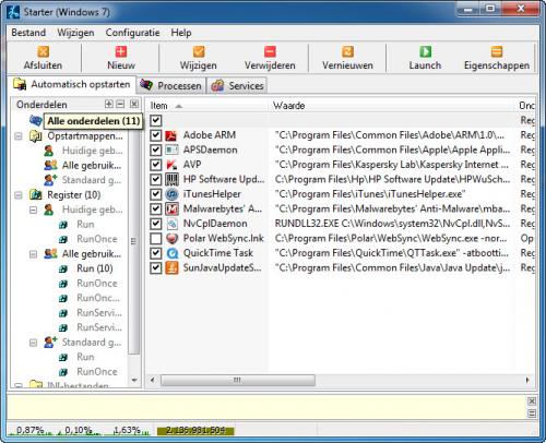 Hallo stegisoft Bedankt voor je reactie. Ik had eerste de hele sleutel "Run" uit het register verwijderd in de hoop dat hij alles terug zou aanmaken na een PC restart. Dat deed de pc uiteindelijk ook wel maar mijn KIS startte blijkbaar niet op (het icoon kwam alleszins niet in de system tray). Ik heb dan uiteindelijk alles terug gezet met een ccleaner backup (omdat de backup die ik van "Run" maakte niet in te voeren was in het register omdat de processen in gebruik waren ofzo). Daarna heb ik dan enkel "Standaard" verwijderd uit de sleutel "Run" en toen maakte hij zelf de nieuwe "Standaard" aan met als waarde "(geen ingestelde waarde)". Nu leest Codestuff Starter "Standaard" niet meer en werkt alles zoals het moet. Ook start nu alles normaal op zoals het hoort en zoals het eerst was! Mvg