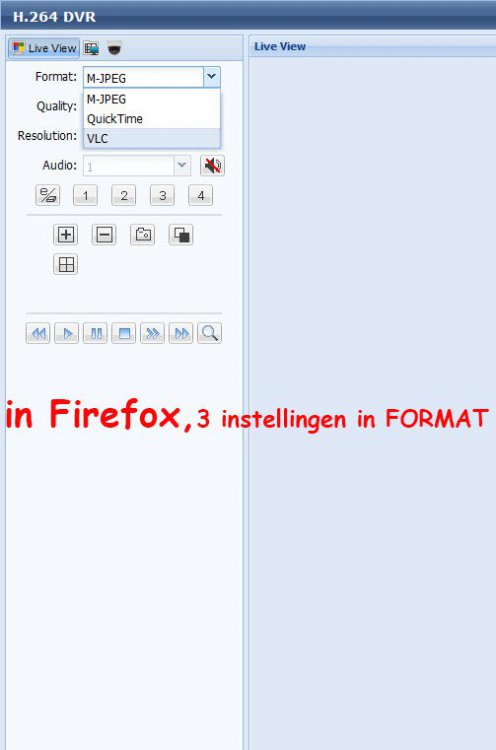 Hallo, ik heb perfect verbinding, PTZ functies en terugkijk perfect, beeld van op mijn laptop met IE11 , zie bijlage, in IE11 zie ik de beelden met H.264 , in FF en Edge is er enkel M-jpeg, Quicktime en VLC, geen beelden, zie bovenaan links in de bijlage bij FORMAT -