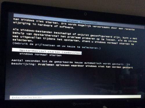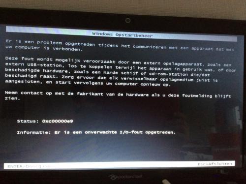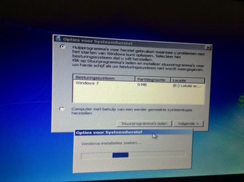 St. Mijn pc start na eens te vallen niet meer op. Geraakt zelfs niet tot het Windows 7 opstartbeeld. Steevast krijg ik het onderste eerste scherm te zien. Ik kan niet anders dan enter of esc duwen, waarna ik het tweede scherm hieronder krijg: Als ik bij dat tweede scherm de 2 opties probeer (opstartherstel of win normaal starten) krijg ik telkens opnieuw het eerste scherm te zien... Ik kan dus geen kant uit... Ook opstarten in veilige modus geeft hetzelfde resultaat. Enig opzoekwerk via google leert mij dat de vermelde status op het eerste scherm 0xc00000e9 zou betekenen dat de harde schijf beschadigd is. Dat voorspelt dus weinig goeds. Het enige wat ik wil is dat ik mijn gegevens er kan afhalen, heb wel n back-up maar niet van alles! Dus 1x opstarten zou voldoende zijn of hoe geraak ik in godsnaam een keer aan die gegevens zodat ik ze kan overzetten naar externe schijf. pc al proberen op te starten vanuit win 7 installatie cd om dan systeemherstel uit te voeren vanaf de cd. Cd start op, ik kan taal en zo kiezen alsook systeemherstel aanklikken. Echter loopt dit dan weer vast bij het zoeken naar Windows installatie, zie scherm hieronder, dat duurde anderhalf uur en bij tweede poging weer een half uur zonder resultaat. Ik krijg ook de kan niet om op het venster erachter iets aan te klikken, hij gaat meteen over naar dat zoeken en dat is abnormaal lang blijven wachten ... Dan geen andere keuze dan pc af te leggen of nog uren blijven wachten. Graag jullie advies zodat ik nog een keer aan mijn gegevens geraak. Dank u! -