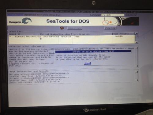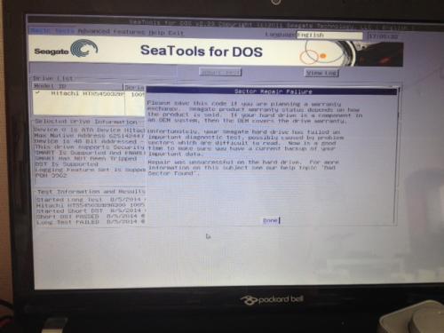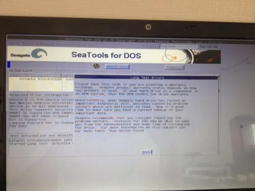 Bedankt Clarkie voor je tijd en advies. - Dus bij installeren upgrade geeft cd aan dat je eerst pc moet opstarten tot in het bureaublad - en dat kan de pc nog niet - en dan pas het schijfje van windows7 opstarten. Dat schijfje is alleszins legaal, gekocht via het werk en was uitzonderlijk aanbod voor onderwijzers, blijkt wel dus dat het enkel een upgrade versie betreft, je moet dus al een vorige Windows versie op je pc staan hebben (wat het geval is). Ik heb de 'long test' via Seatools uitgevoerd maar dat ziet er niet te best uit. Test vroegtijdig afgebroken met dit als resultaat: Hier op 'Done' geklikt, deed dan precies vanzelf een kortere test met dit als resultaat: Dan op 'Done' geklikt en meteen verscheen dit: Ziet er volgens mij al minder goed uit, andere mogelijkheden met dit programma misschien? Groeten -