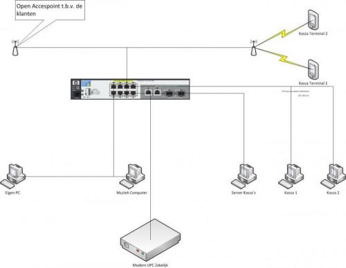 3. Hallo, Een vriend vroeg mj om een netwerk aan te leggen in zijn restaurant omdat ik een klein beetje ervaring heb Nu speelt het volgend puntje: Hij heeft een kassasysteem, pin en pc waar hij zelf op werkt. Een accespoint voor personeel en een Accespoint voor klanten. Nu wil hij graag voorkomen dat de klanten niet op de zijn systemen kunnen komen, maar wel toegang hebben tot het internet. Nu weet ik uit eigen ervaring dat je systemen kan splitsen door middel van Vlan's, maar is hier dan ook een separate aansluiting voor internet voor nodig of kunnen beide gebruik maken van hetzelfde Wan ip-adres? Als switch word er gebruik gemaakt van de HP2520 Procurve. en hij heeft een zakelijk UPC aansluiting met 1 ipadres Graag advies, en ook hoe je het 1 en ander het beste kan aanpakken. B.V.D.