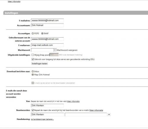 Beste, Wegens problemen met andere mailprogramma' s wil ik nu webmail van Telenet gebruiken. Ook wil ik daar mijn externe hotmail-account aan toevoegen. Maar dat lukt niet helemaal. Ik kan enkel maar de IMAP-server toevoegen. Ik kan nu mails versturen vanaf mijn hotmail-account in webmail, maar ik kan er geen ontvangen. Hoe kan ik dat oplossen ? Zie ook bijlage voor mijn instellingen die ik wel kan invullen. Mijn emailadres heb ik hier als voorbeeld ingevuld als: aaaaa.bbbbbb@hotmail.com. Dank bij voorbaat, Dirk -