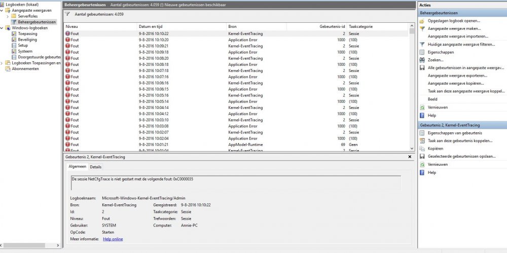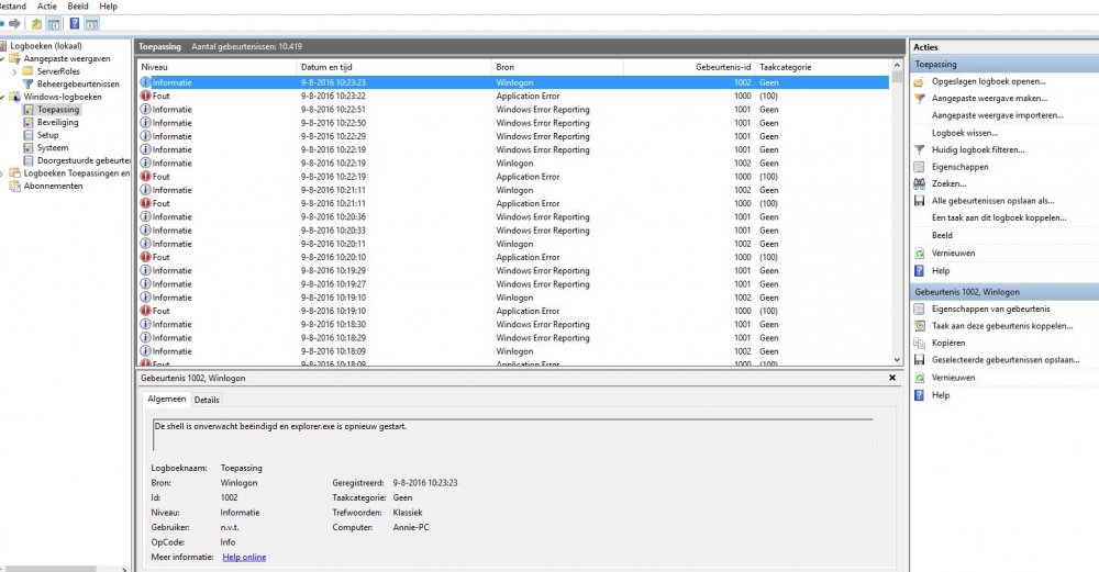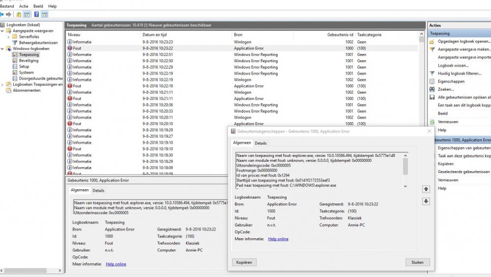 Hierbij enkele foto' s van het logboek met de melding van een fout in explorer.exe, na het uitvallen van de Verkenner.... Ik test momenteel je voorstel 3 uit met de mapoties, en waarempel dit lijkt voorlopig te werken - de verkenner staat nu al enkele minuten open. Benieuwd of het zo blijft na heropstarten, want ik stel ook vast (zie andere topic van mij), dat hij zijn instellingen niet doorvoert)... Alvast bedankt voor de hulp. mvrgr,