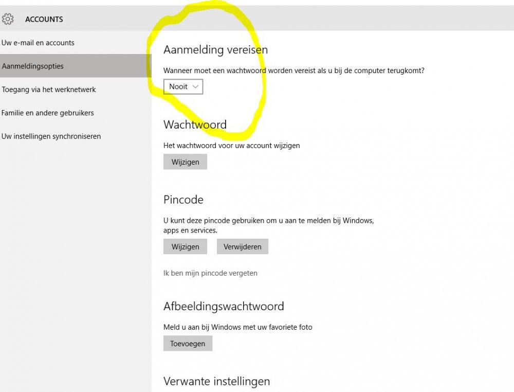 Beste, Spijts alle inspanningen en goede raad blijft de laptop hardnekkig zijn eigen willetje doordrijven. Dus de instellingen blijven standaard staan zoals na de upgrade; hij blijft een wachtwoord vragen enz... Maar goed, er valt mee te leven en we kunnen er niet blijven onze en uw tijd aan verdoen. De verkenner blijft al staan, en dat is ook al belangrijk. We kunnen er mee werken en dat is voldoende. Maar dat was nu eenmaal de reden waarom ik zo lang heb getwijfeld om een upgrade naar Win 10 te doen. In ieder geval bedankt voor jullie raad en steun. mvrgr, Dirk