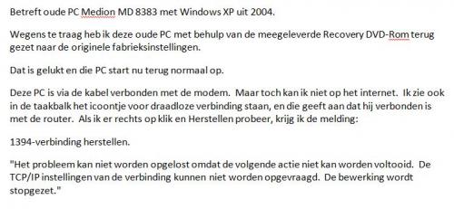 1. Betreft PC Medion MD 8333 Wegens onbruikbaar omwille van zijn traagheid heb ik deze PC teruggezet naar de fabrieksinstellingen. Dat is gelukt, maar ik slaag er niet in om verbinding te maken met het internet. Ik vermoed dat de drivers niet in orde zijn, maar ik kan ze niet updaten vermits ik geen verbinding krijg met internet. Volgende vermelding kreeg ik dan op het scherm: " De TCP/IP instellingen van de verbinding kunnen niet worden opgevraagd. De bewerking wordt stopgezet." Hoe kan ik hiermee terug op het internet ? Dank bij voorbaat, Dirk