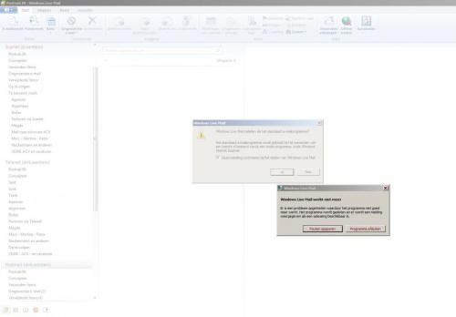12. Beste, Ik had goede hoop na die schijfcontrole omdat WLM al verder kon opstarten dan voorheen. Nu kwam het startscherm even tevoorschijn, dan vroeg hij of hij WLM mocht instellen als standaard-emailprogramma, dan klik ik NEEN, en dan komt weer die vervelende melding dat WLM niet meer werkt... - zie bijlage. mvrgr, Dirk