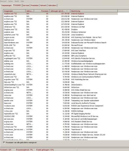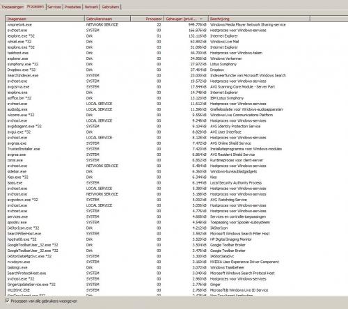 15. Beste, In bijlage stuur ik nogmaals een afdruk van mijn Taakbeheer - Processen. Momenteel draait hij rond de 70 - 75 % met geopende IE, Windows Live Mail en Excel. De PC is wel veel verbeterd alhoewel hij soms toch nog de 90 % voorbijgaat en soms nog vastloopt (reageert niet) Dat vastlopen komt meestal weer goed na enkele minuutjes. Maar ik kan er momenteel mee leven. Wat me wel nog stoort is het programma "IBM Lotus Symphony" welke ook altijd mee opstart. Ik heb er geen idee van waar ik dat kan uitzetten. Via de site van Microsoft: http://windows.microsoft.com/nl-be/windows/stop-program-running-automatically-windows-starts#1TC=windows-7 kan ik daarvoor gebruik maken van Autoruns. Maar ik zie er tegenop om weer een extra programma erbij te gooien ! mvrgr, Dirk