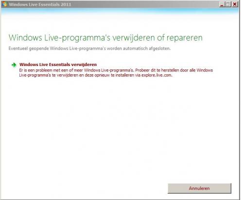 7. Beste, PC met Windows 7. Nadat de PC eerst vastliep tijdens het opstarten van Windows Live Mail, is het nu al zo ver gekomen dat het programma niet meer wil opstarten. Ik krijg dan de melding: Windows Live Mail (2011) werkt niet meer. Ik heb al enkele malen systeemherstel willen uitvoeren, maar ook dat helpt niet want ik krijg dan telkens de melding dat het systeem niet werd teruggezet. Hoe kan ik nu het programma terug aan de praat krijgen ? Dank bij voorbaat, Dirk