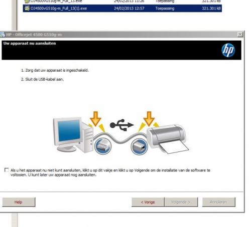 Installatie printer HP Officejet 4500 Wireless lukt niet (meer)DeeWee plaatste een topic in Archief Hardware algemeen Geachte, Computer met Windows 7 - 64 bits. De printer was al correct geïnstalleerd in oktober 2012, maar vorige week kreeg ik er problemen mee. Na opstarten van PC en printer kon ik nog 1 printopdracht uitvoeren, maar bij een tweede printopdracht bleef het document hangen in de wachtrij. Ik heb de printer nu volledig verwijderd, alsook alle software hieraan verbonden. Ik heb de sofware OJ4500vG510g-m_Full_13.exe gedownload van de site van HP en wil die nu installeren. Hierbij is de printer ingeschakeld maar de USB-kabel ontkoppeld. Als hij vraagt om de USB-kabel aan te sluiten, kan ik niet verder naar "volgende".Zie bijlage. Tevens zie ik dat door de usb-kabel aan te sluiten, die installatie van die driver (?) bezig is, maar ook dan krijg ik de foutmelding dat er geen stuurprogramma' s zijn geïnstalleerd. Kan u mij verder helpen om die printer (aangekocht in okt 2012) aan de praat te krijgen??? Dank bij voorbaat. Dirk