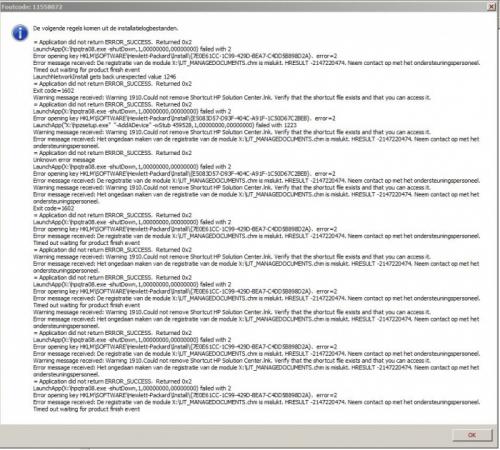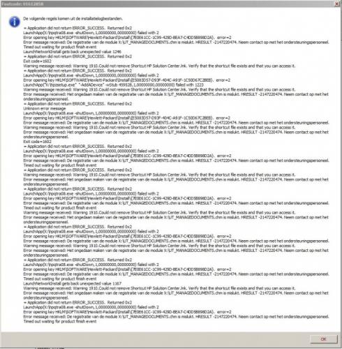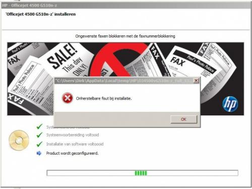 Installatie printer HP Officejet 4500 Wireless lukt niet (meer)DeeWee reageerde op DeeWee's topic in Archief Hardware algemeen Beste, Opdracht uitgevoerd, printersoftware HP verwijderd, CCleaner geïnstalleerd en laten draaien tot fouten verwijderd waren. Heropgestart en HP software (n-z) terug geïnstalleerd. USB-aansluiting wordt weer herkend en de installatie loopt verder. Maar het configureren duurt weer ongeveer 10 minuten tot als er dan weer de "onherstelbare foutmelding" tevoorschijn komt (zie bijlage). Verder in de tweede bijlage weer de foutcode die daarop volgt. Dan komt de melding dat de software wordt verwijderd. Maar bij "apparaten en printers" staat hij als correct geïnstalleerd, ik kan scannen, ik kan printen, en hij heeft nu zelfs al 4 printopdrachten na elkaar gedaan zonder ze in de wachtrij te zetten. Ik denk dat ik het beter zo zou laten. Wat denk jij ??? vrgr, Dirk