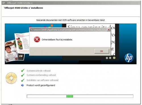 Installatie printer HP Officejet 4500 Wireless lukt niet (meer)DeeWee reageerde op DeeWee's topic in Archief Hardware algemeen Het is geen AMD-processor, en het gaat over de derde printer in je lijstje (de draadloze all-in-one G510n). Herstelpunt heb ik ook al uitgevoerd helemaal na de eerste problemen. Ik heb hem nu draadloos geïnstalleerd, maar tijdens de laatste fase (configuratie) kreeg ik weer de foutmelding dat er een "onherstelbare fout" is opgetreden. Ik zie de printer wel staan bij mijn "apparaten en printers", en ik kon weer eenmaal een pagina uitprinter, maar de volgende printopdrachten blijven weer in de wachtrij staan. En zeggen dat die printer vorige week nog zo goed werkte....