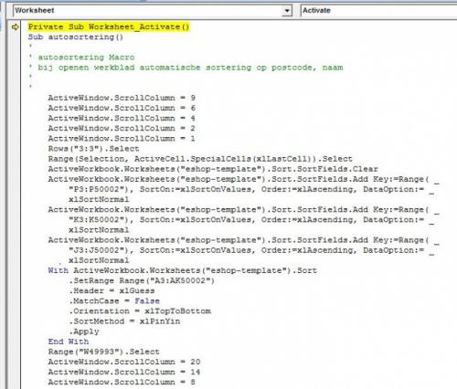 txs, but.. neen zo voorkom ik het probleem niet van de autonummering bij sortering. ik heb de opmaak van autonummering aangepast zodat bij sortering de nummer behouden blijft. Tenzij men de kolom selecteert natuurlijk. Met die reden wou ik die autsortering zodat het steeds juist verloopt en de lijst na aanvulling altijd gesorteerd blijft. Hierbij de excel template met VBA ingevoegd: vb excelforum.xlsm