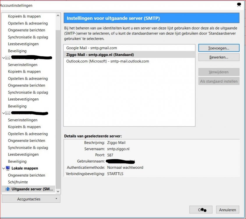 Bedankt voor verwijderen scherm afb. Ik heb in de instelling voor uitgaande server ZiggoMail (upcmail) als standaard ingesteld ,was eerst Gmail als Standaard ingesteld. Wacht dus nu af als dat iets uitmaakt. Vraag kan Firefox ook voor Thunderbird ???