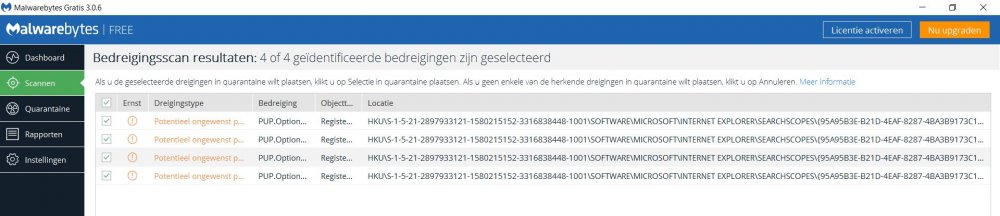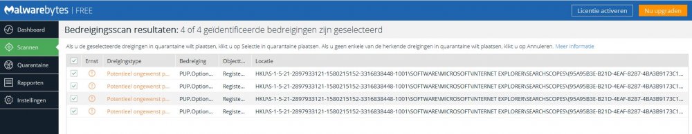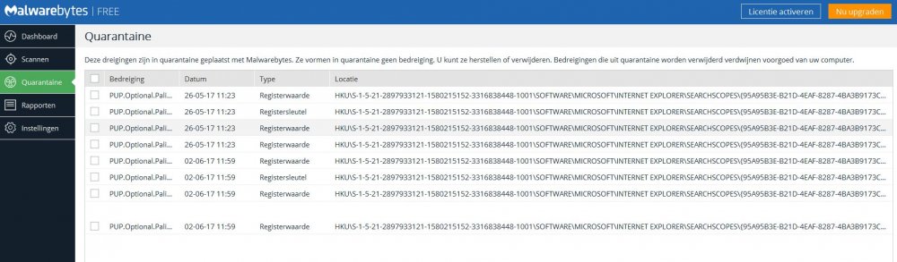 Ik heb mijn computer heden gescand met Malwarebytes en vind weer dezelfde PUP progje . Kijk maar naar de bijlage 2-6-17 en vergelijk met de Quarantaine lijst . Hoe kan dit ??? Wat kan ik ertegen doen ???