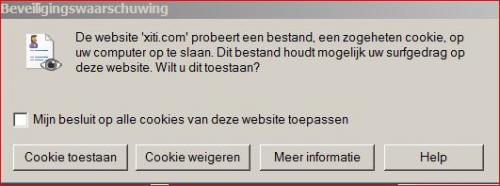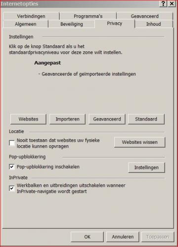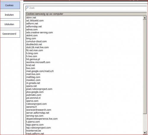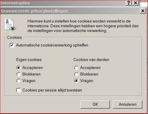 Dag Kape, ik heb de volgende stappen genomen:Extra--Internet Opties--Privacy--Geavanceerd en bij de laatste aangevinkt : vragen. Zie bijlage Als ok nu het Internet /Startpagina.nl op ga, verschijnen steeds velden met allerlei aanvragen om cookies te plaatsen die ik dan weiger. Het gevolg is dat er bijna geen cookies meer worden geplaatst zie bijlage Cookies D. Wel erg onhandig om steeds dat veldje met de cookie vraag te klikken maar het helpt wel. Moet toch een manier zijn om dit automatisch te doen ??? Ramon