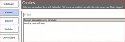 Beste Kape, het is gelukt en alles lijkt prima te werken. Mijn H-D schijfvolume is met 5.3 Gb toegenomen. Heel erg bedankt.. nog een klein vraagje. Als ik de cookies verwijder zijn ze na enkele minuten terug. In CCleaner kan je de cookies die je wilt behouden selecteren en de andere verwijderen.het zijn zowat 3 velletjes A4 en wel ca.1Gb Mijn vraag is hoe ik de overbodige cookies definitief kan verwijderen. Ramon
