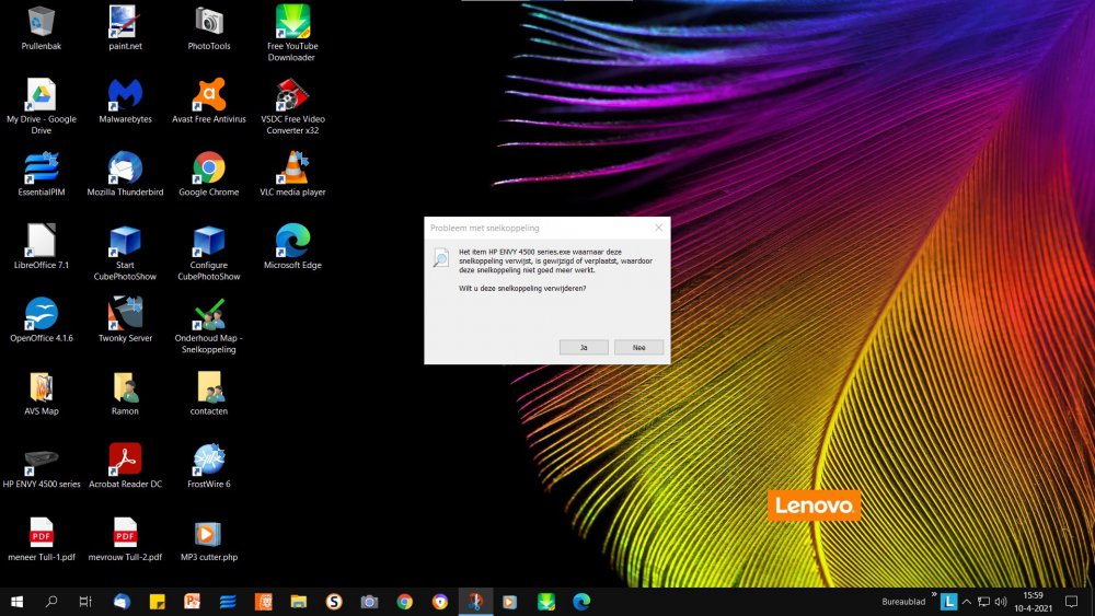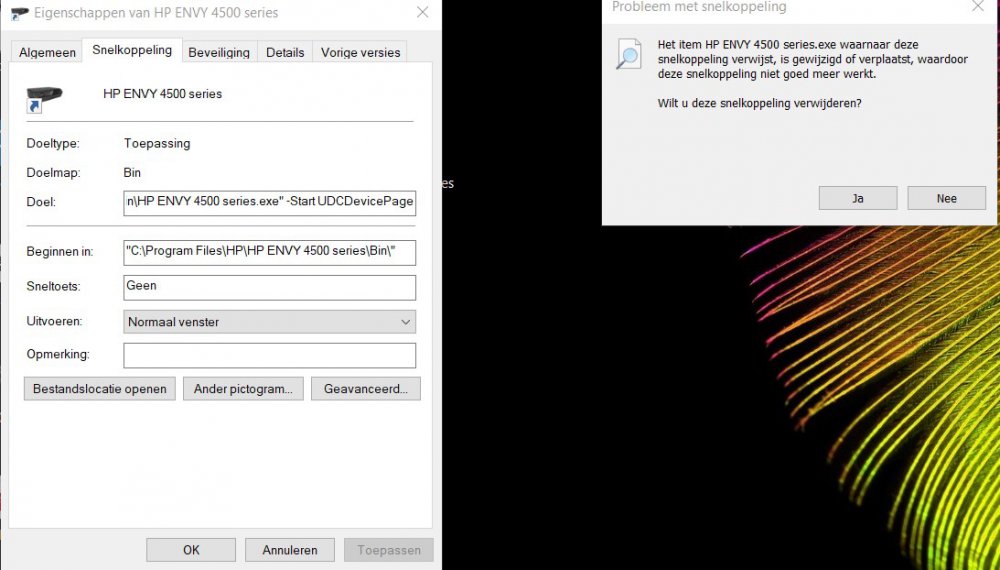 Ik heb de HP Printer software opnieuw gedownload en HP Smart App geinstalleerd ook een nieuwe snelkoppeling op het buroblad geinstalleerd en geaktiveerd. Als ik nu op de snelkopp. klik ktijg ik --zie bijlage. Ik snap er nu niets meer van.