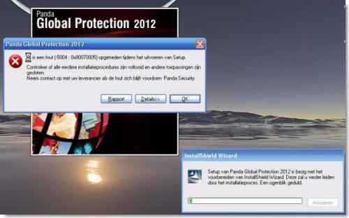 Installatie Panda Global Protection 2012 Probeer het product te installeren op PC langs CONFIGURATIE/SOFTWARE lukt niet. Op de twee laptops helemaal geen probleem alles liep vlotjes. Probeer langs verkenner met Panda install, lukt niet altijd dezelfde opmerking foutcode zoals hieronder. Probeer dan de vorige versie te verwijderen langs CONFIGURATIE/SOFTWARE lukt niet, steeds dezelfde opmerking. Probeer dan te verwijderen met TweakNowRegCleaner, lukt niet steeds dezelfde foutcode. Probeer dan maar langs ALLE Programma’s / Panda Global Protection 2011 / verwijderen lukt niet. Probeer langs internet te downloaden, lukt niet dezelfde foutcode. TweakNowRegCleaner Foutcode: -5004 : 0x80070005 Foutgegevens: >SetupDLL\SetupDLL.cpp (3078) pAPPanda Global Protection 2011 PVENDORanda Security PGUID:81A25967-DB85-4B48-A8A7-D25AC191DEE4 $11.0.0.28844 Via Internet proberen te downloaden Foutcode: -5004 : 0x80070005 Foutgegevens: >SetupDLL\SetupDLL.cpp (3078) pAPPanda Global Protection 2012 PVENDORanda Security PGUID:81A25967-DB85-4B48-A8A7-D25AC191DEE4 $11.0.0.28844